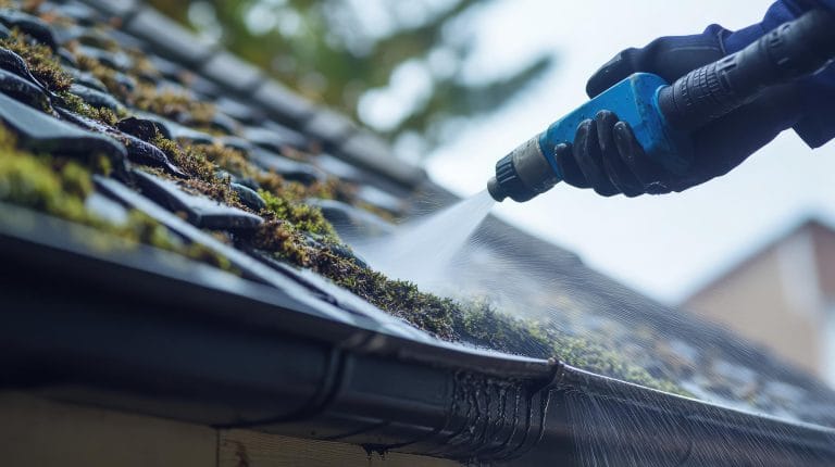 Nous privilégions un brossage soigné pour retirer les amas de mousses sans agresser la couche protectrice naturelle de vos tuiles avec une pression excessive.